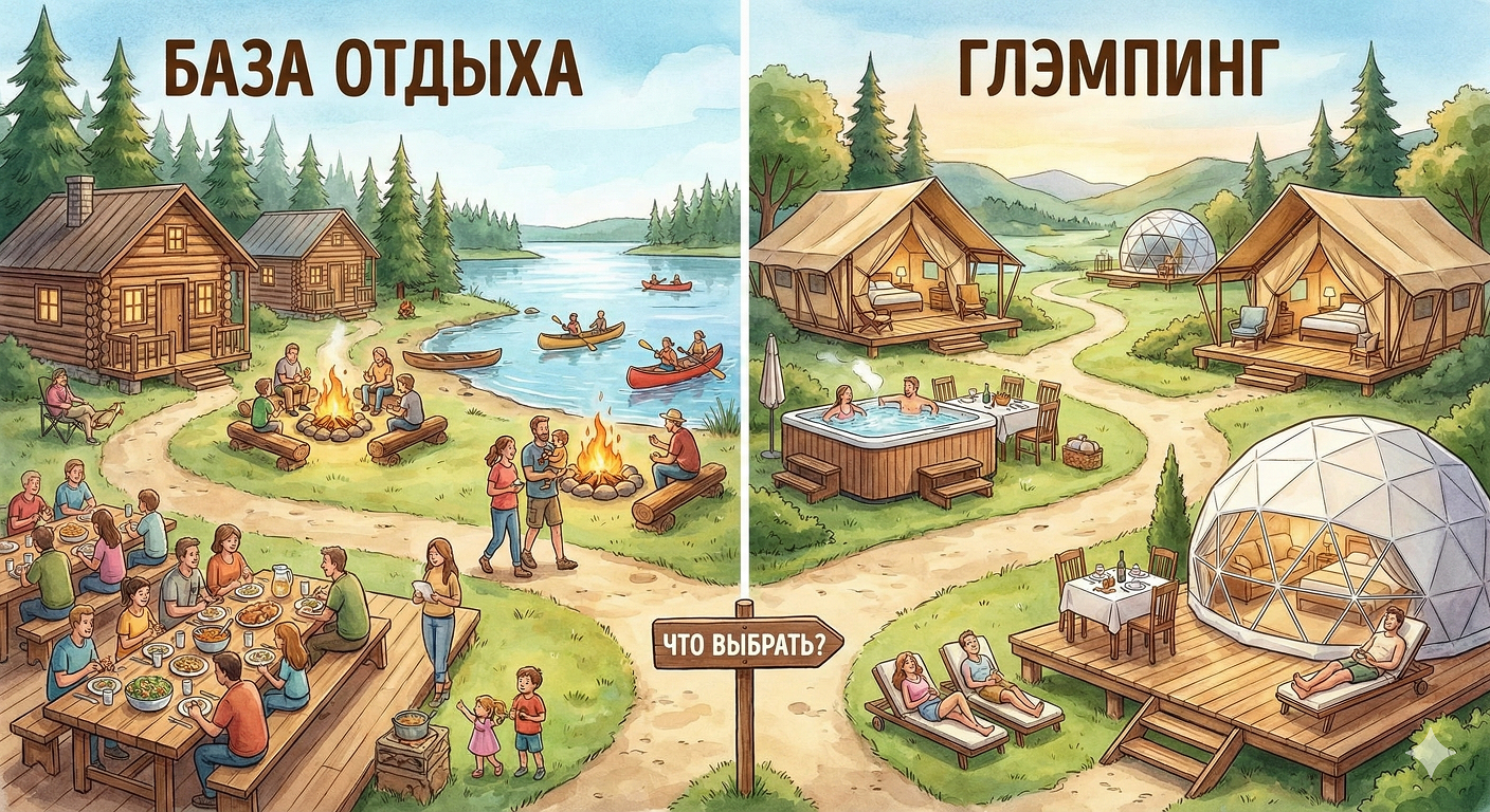 Если цель — активное времяпрепровождение и общение с разными компаниями, база отдыха может подойти. Но если хочется тишины и уюта — не всегда.